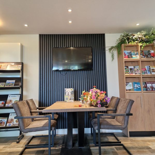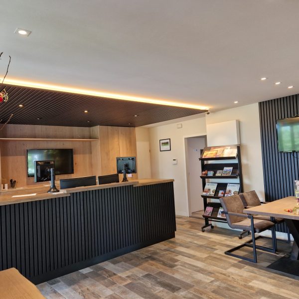 Camping Berkenrode Beekbergen Complete make-over van een vakantiepark receptie. Verlaagd akoestische plafond, akoestische bekleding van de balie en wandpanelen. TERUG NAAR OVERZICHT
