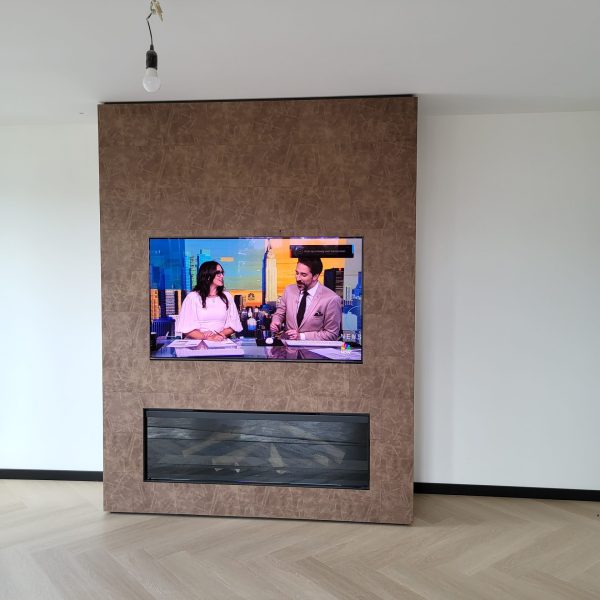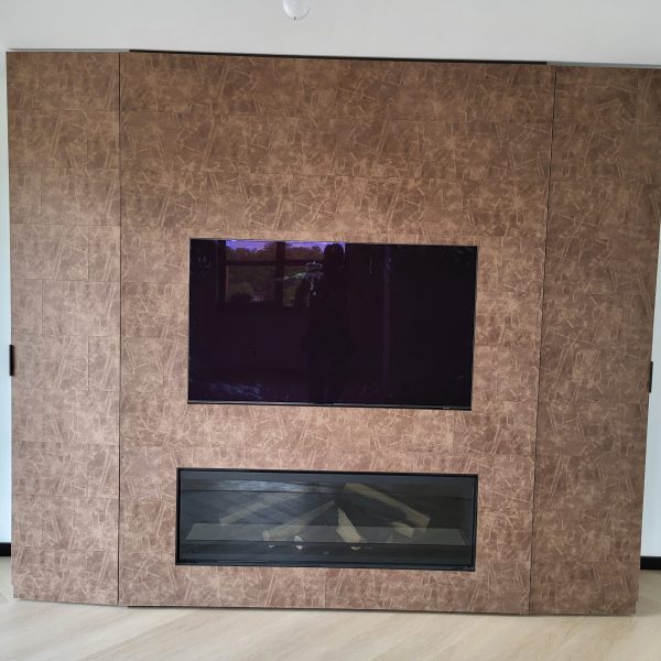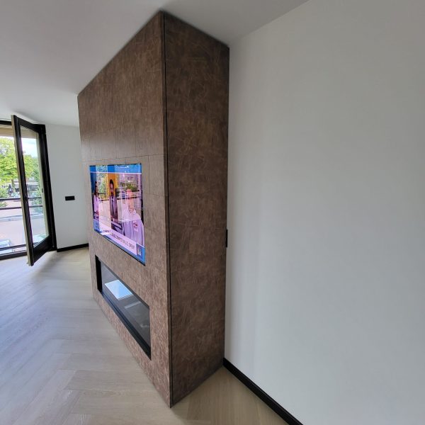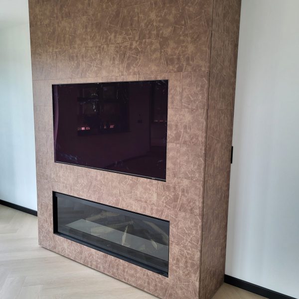 Tv-meubel bekleed met lederen panelen.