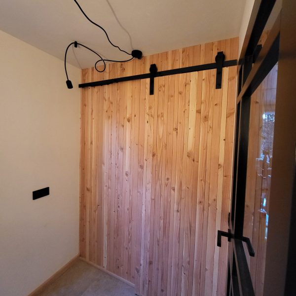 Douglas kast en wand Harderwijk Douglas lattenwand met schuifdeur. Schoenenkast en hoge kast voor stofzuiger etc. TERUG NAAR OVERZICHT
