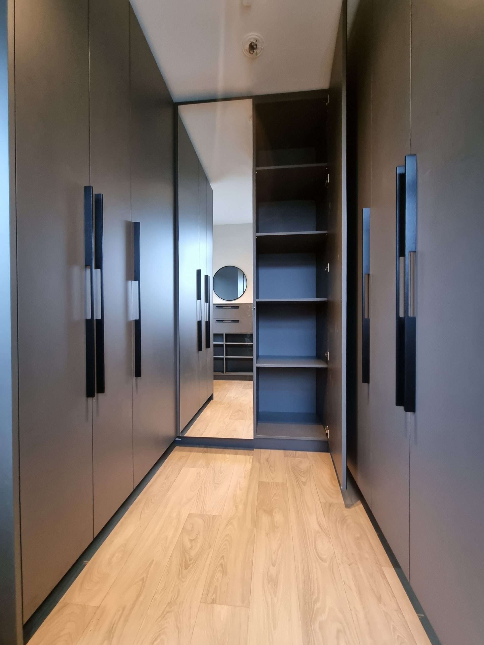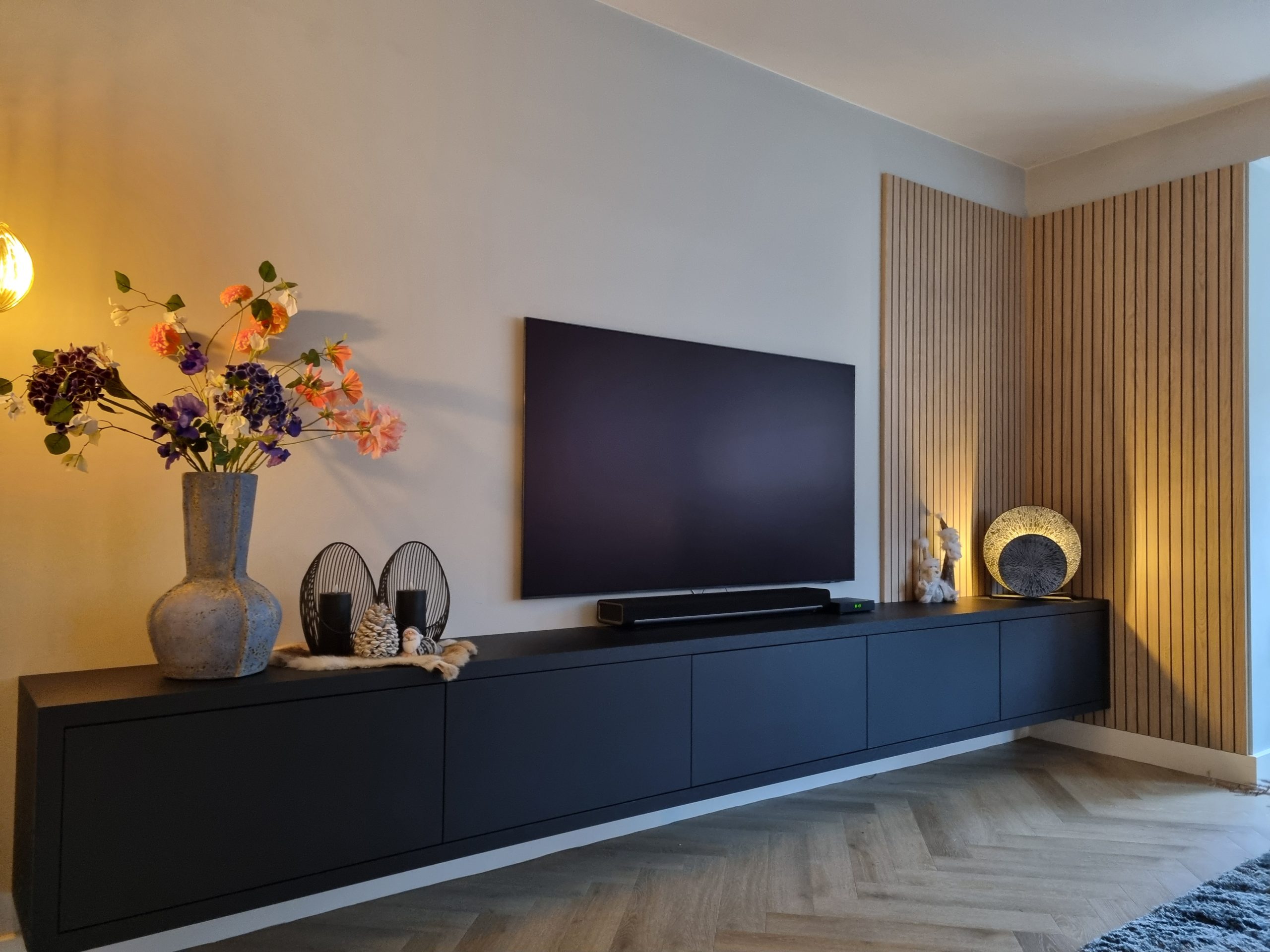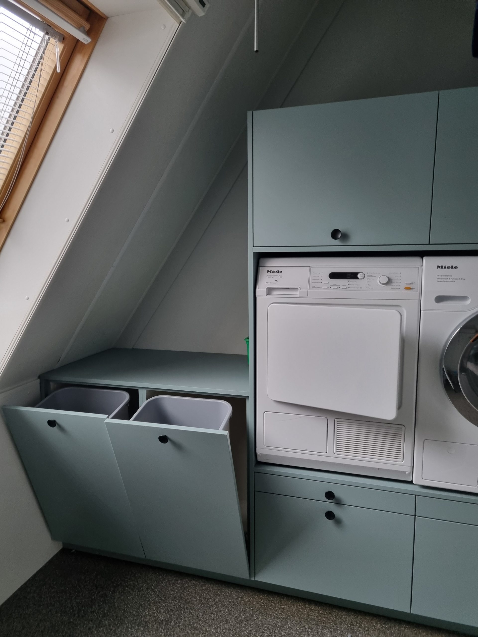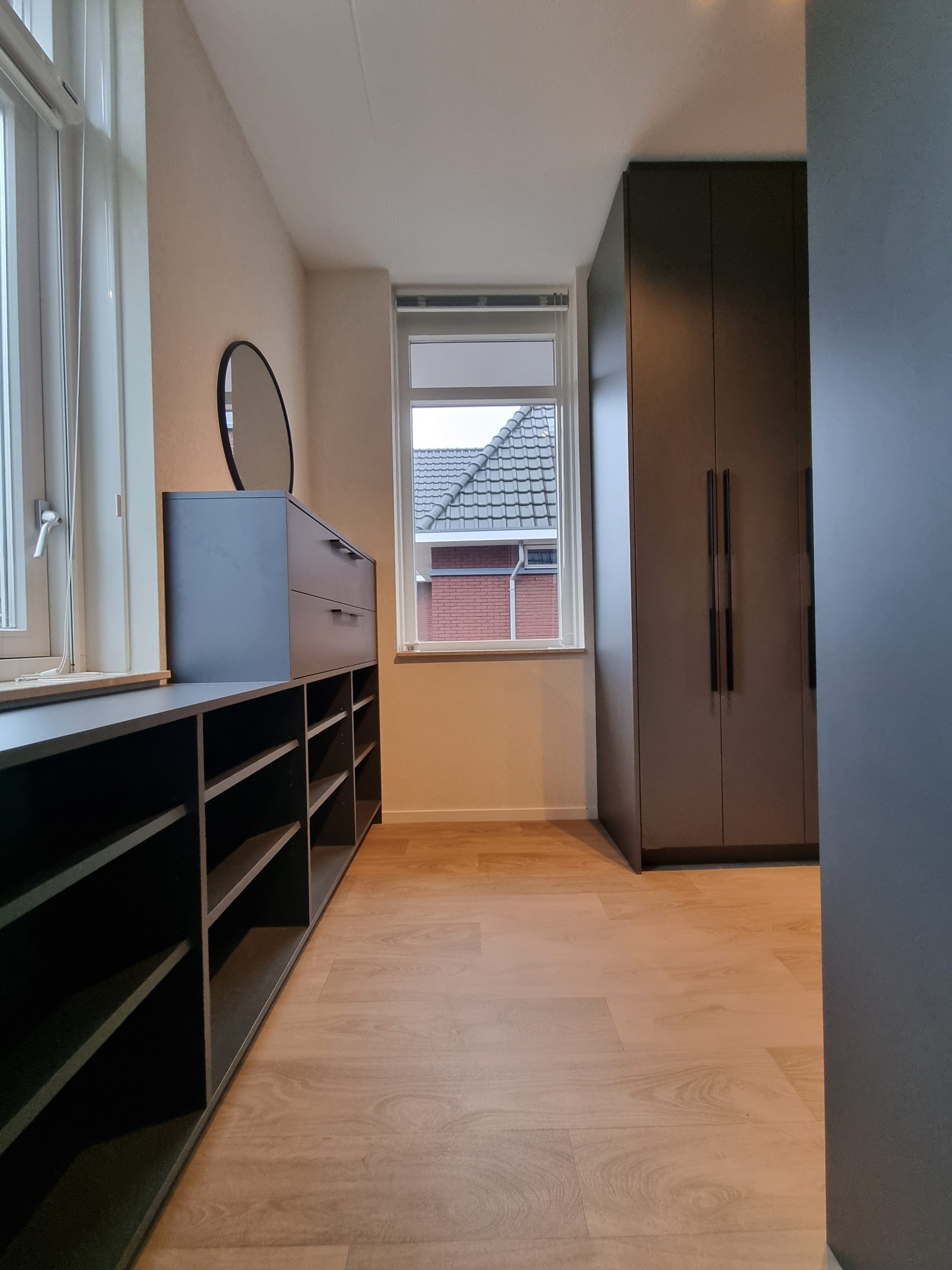 Woonhuis Harderwijk Tv meubel met akoestische wand. Inloopkleding kast: roeden, lades en legplanken verstelbaar op hoogte. Ruimte inloopkleding kast afsluitbaar door middel van paneelschuifdeur. Was meubel: wasmachine & droger op hoogte, lades, inbouw wasmand. TERUG NAAR OVERZICHT